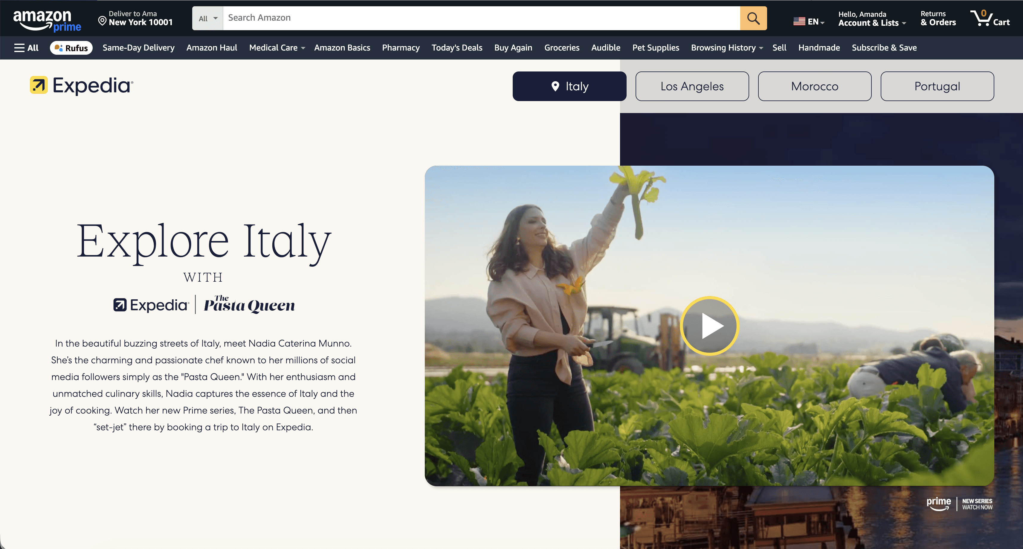 Bridging the gap between travel inspiration and booking by designing a content-driven commerce experience that connects Prime Video destinations to Expedia's hotel search.